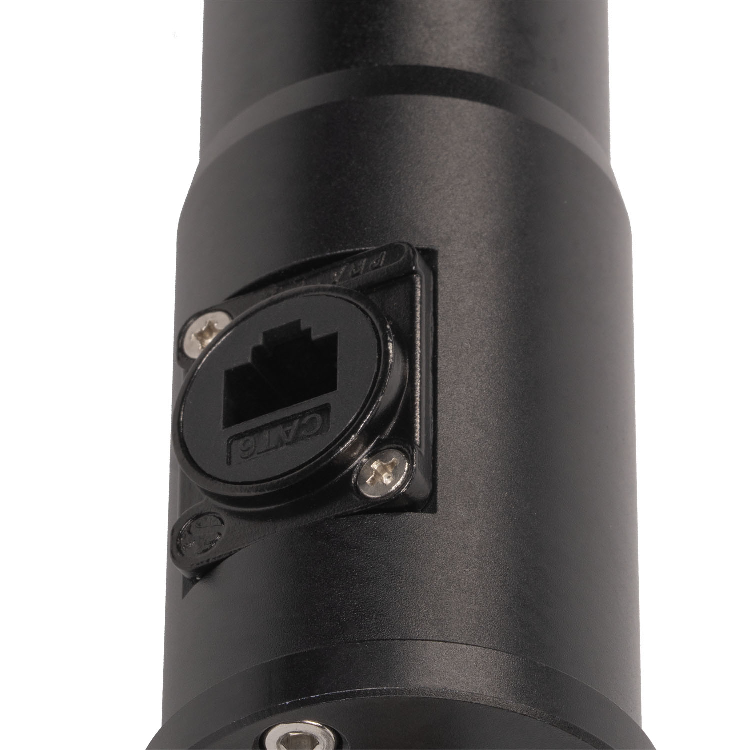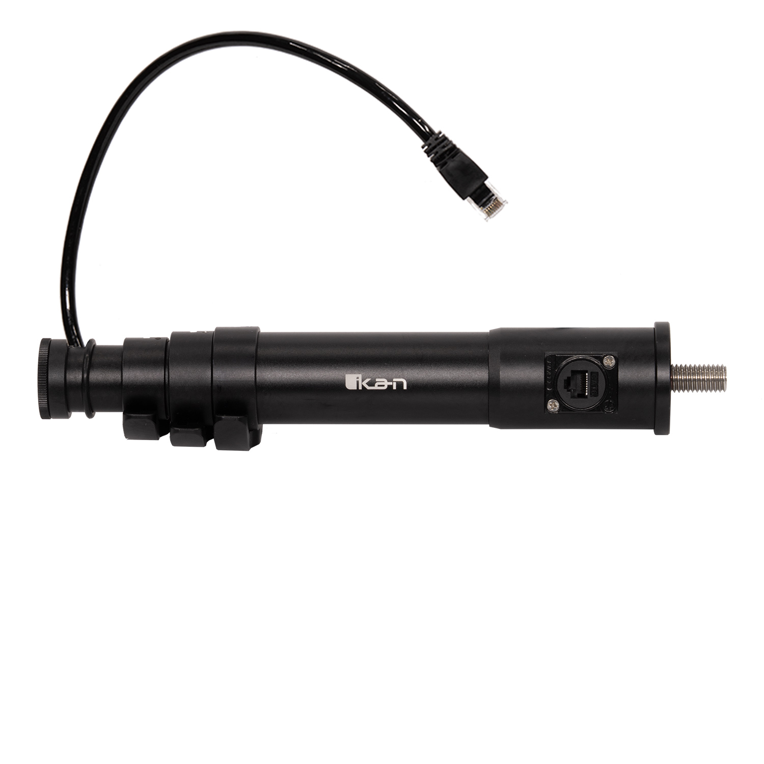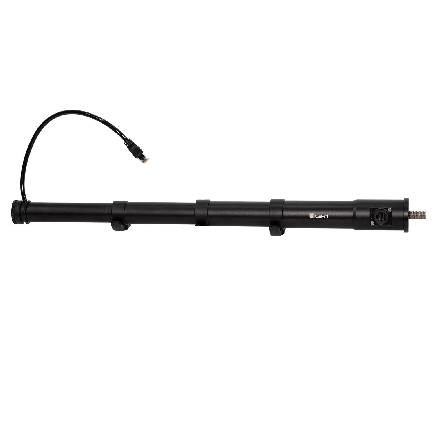 The LSH-POE streamlines power and data distribution with an RJ45 input located directly on the pole. An internal coiled Cat6 cable routes cleanly through the assembly and terminates in a pigtail connector designed to plug directly into your PoE-enabled studio light.