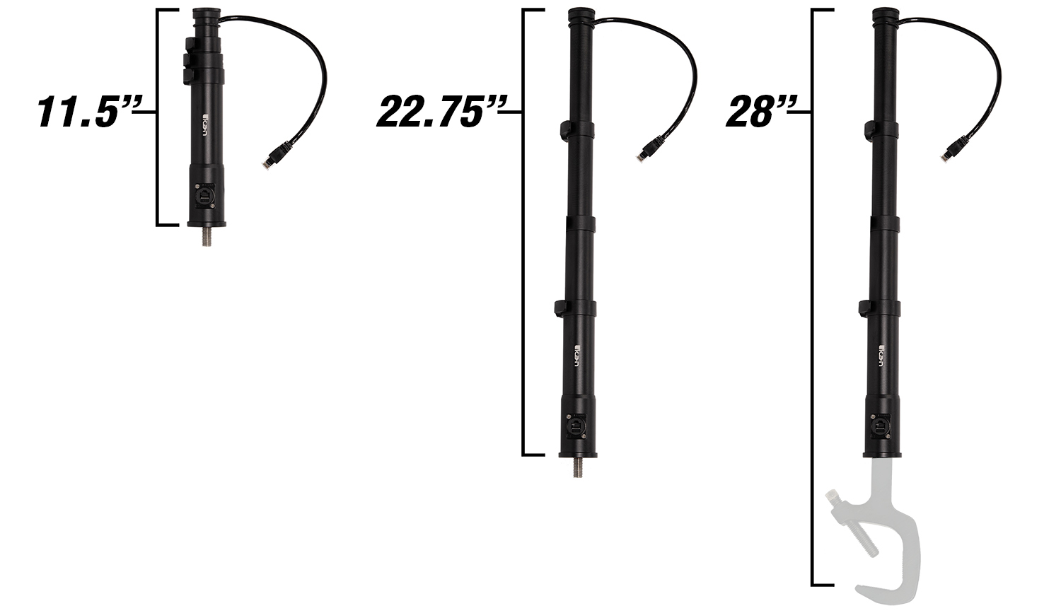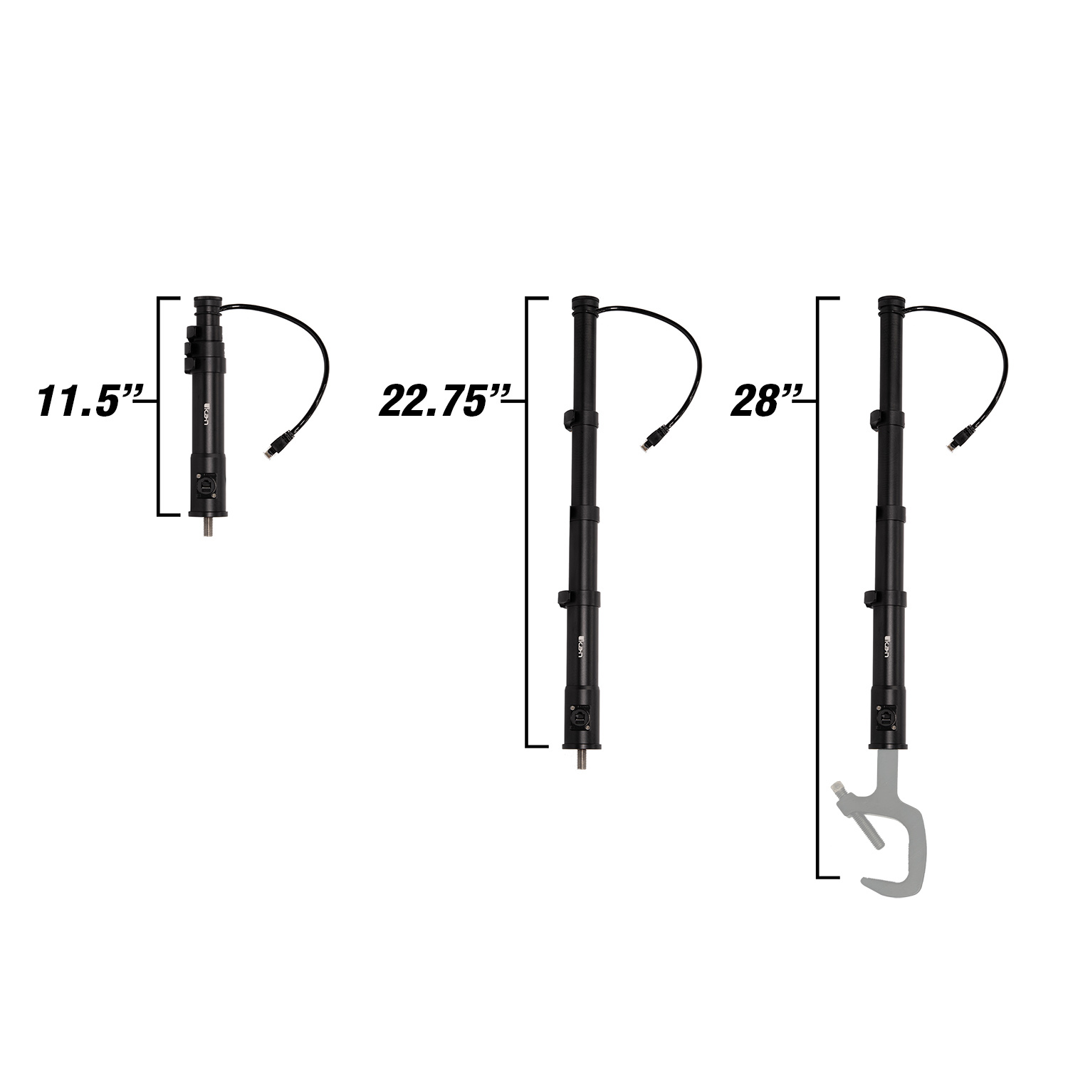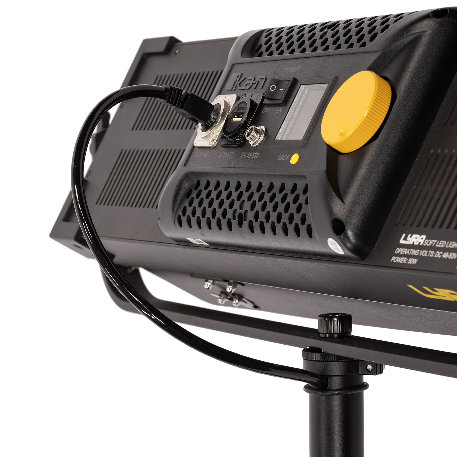 The LSH-POE streamlines power and data distribution with an RJ45 input located directly on the pole. An internal coiled Cat6 cable routes cleanly through the assembly and terminates in a pigtail connector designed to plug directly into your PoE-enabled studio light.