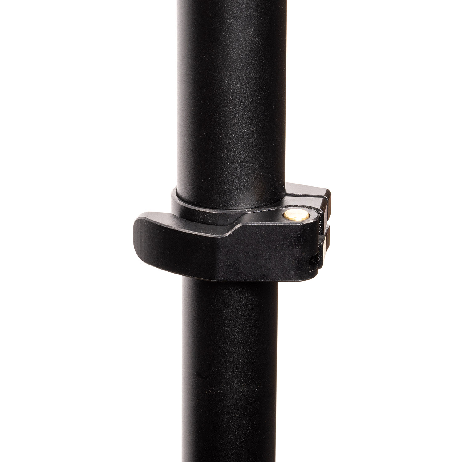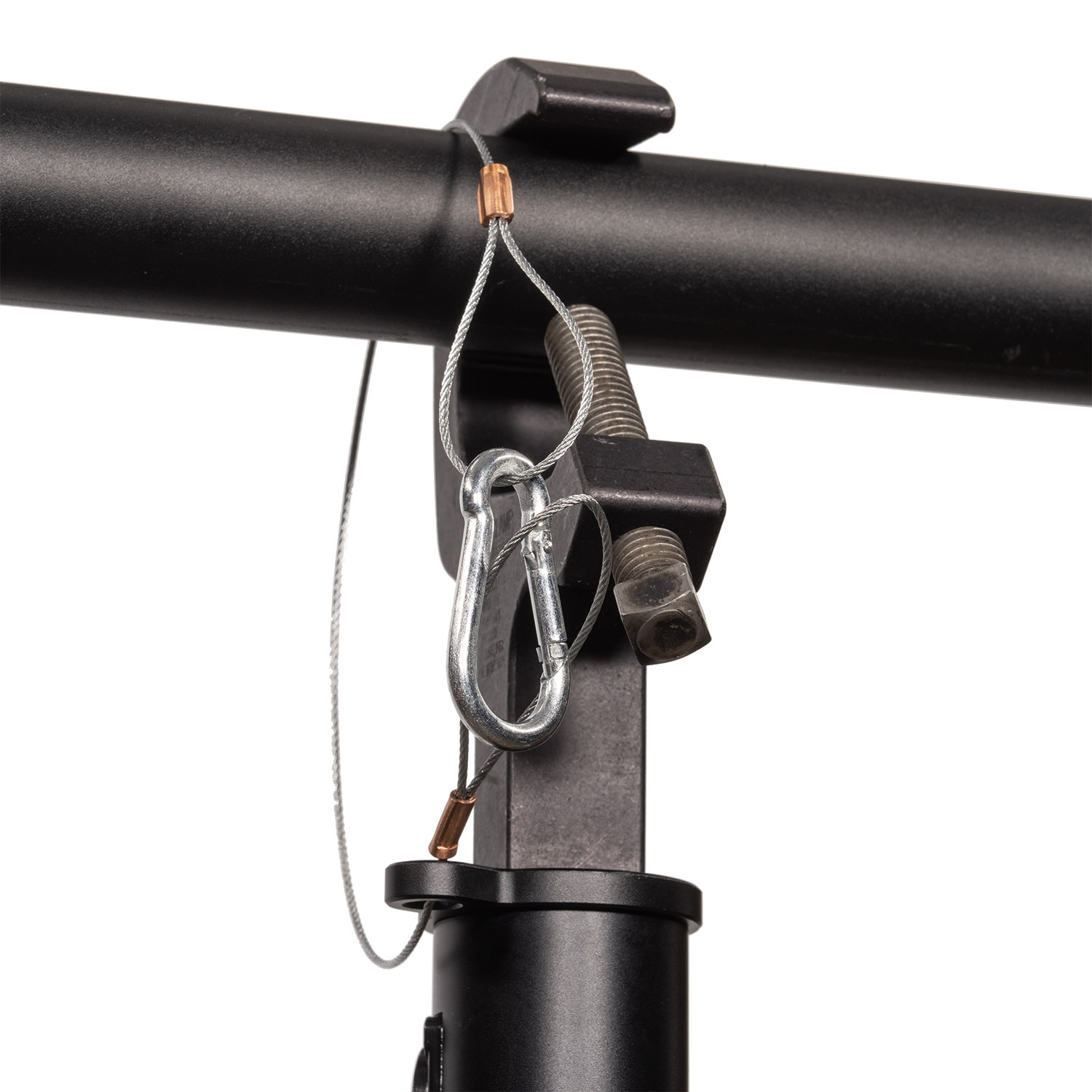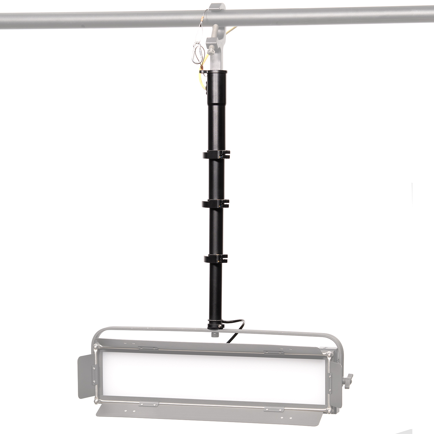 Convenient installation begins by threading the top section of the light pole into a Mega Clamp. This assembly mounts directly onto the pipe of a lighting grid, creating a stable overhead support structure.