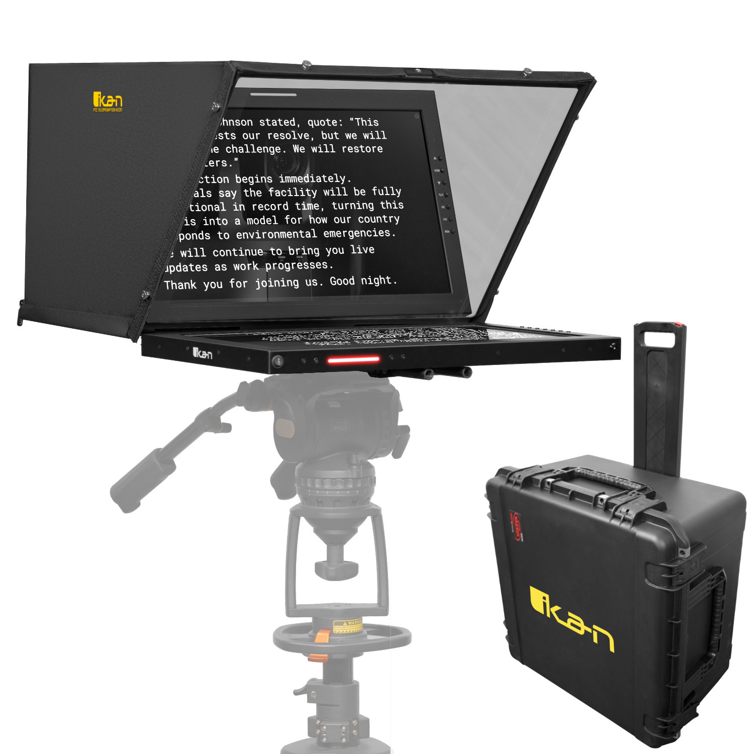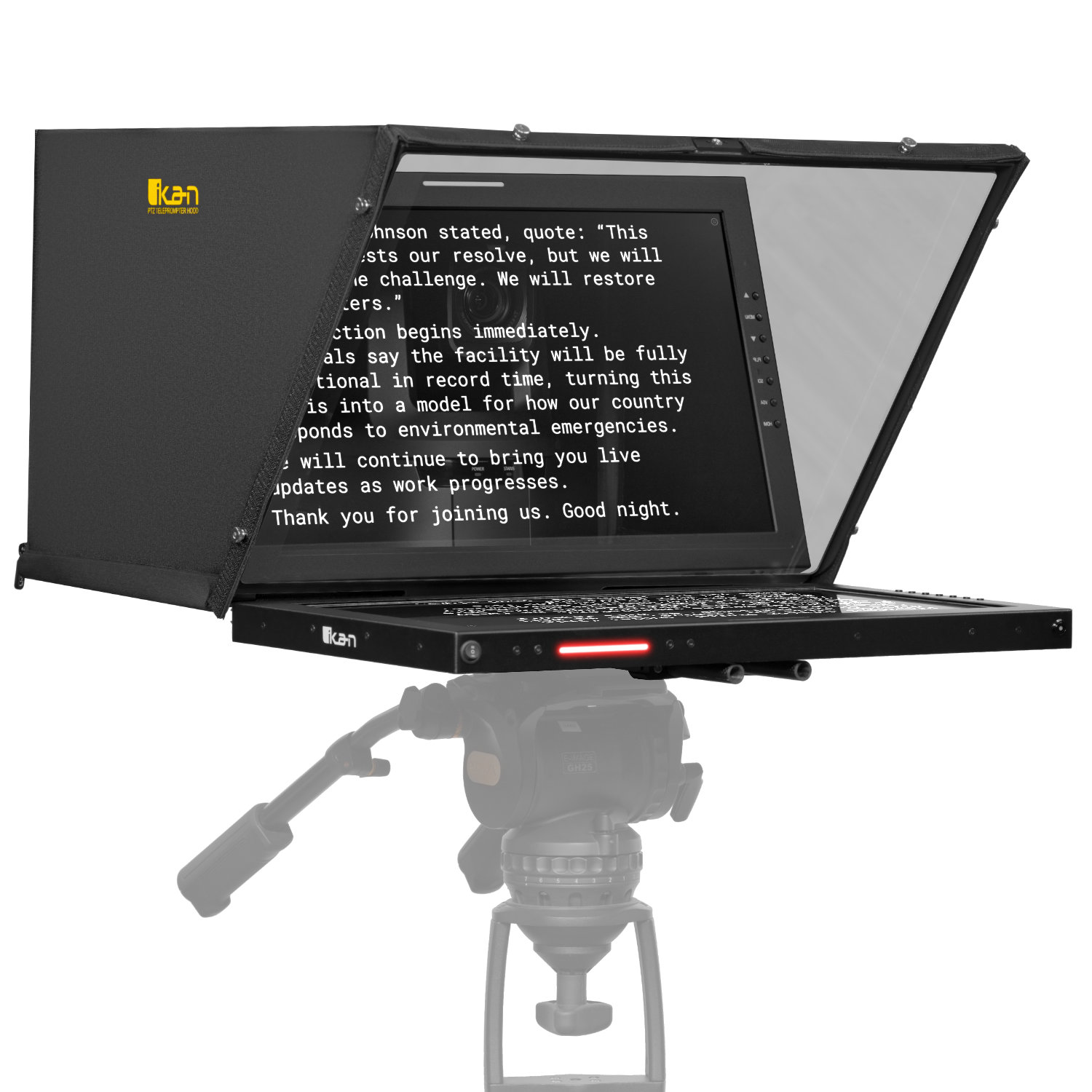 The Ikan PTZ Teleprompter system is a unique PTZ teleprompting system that enables the PTZ camera’s pan, tilt and zoom capabilities while still behind the reflective teleprompter glass. You can easily pan the camera between multiple people reading from the same script.