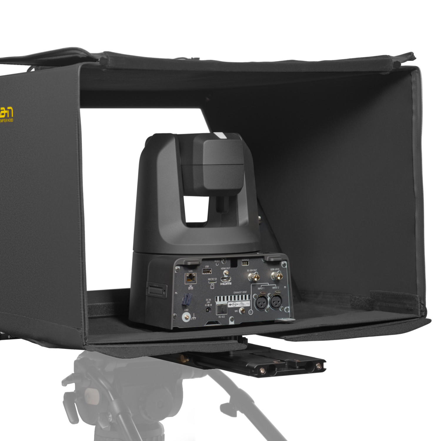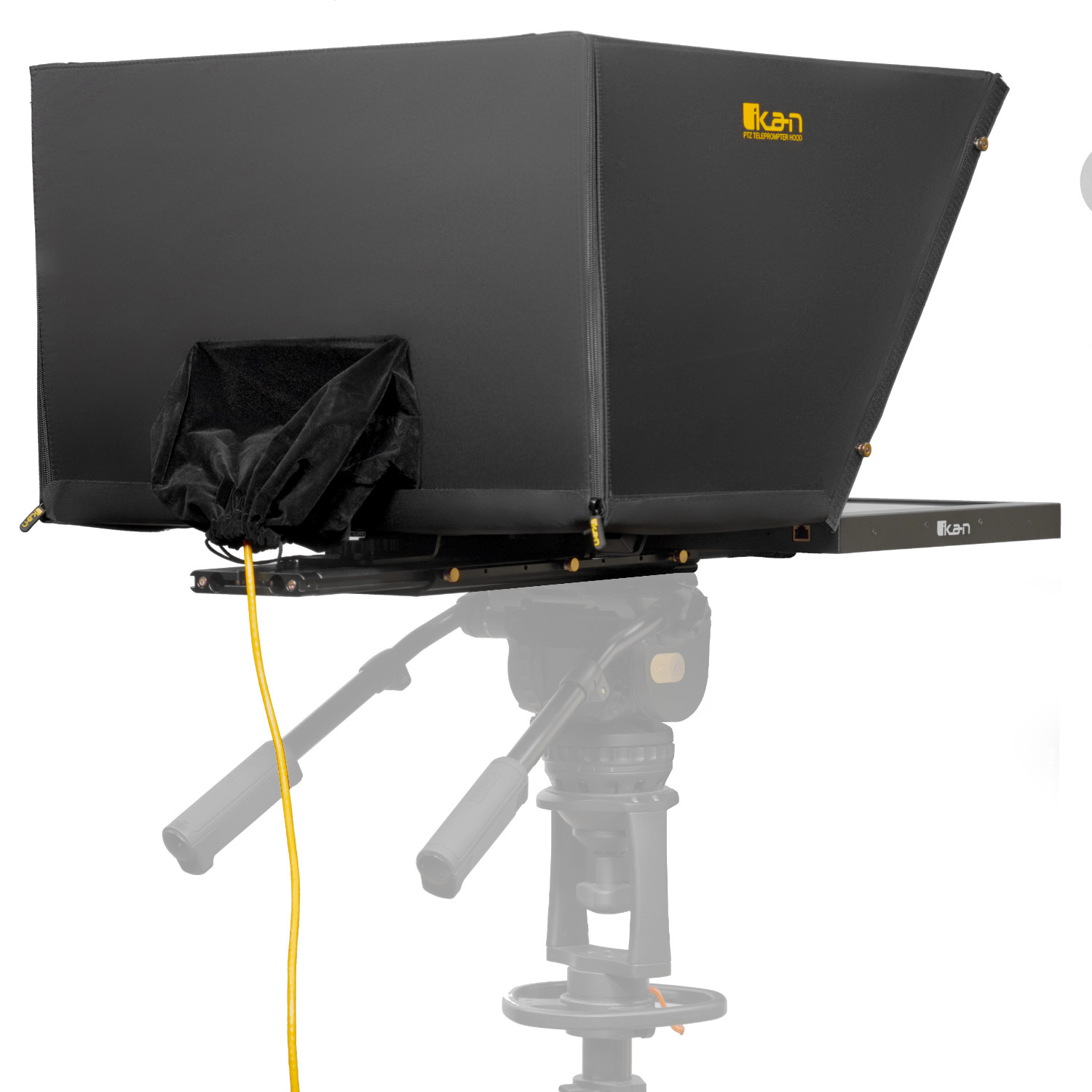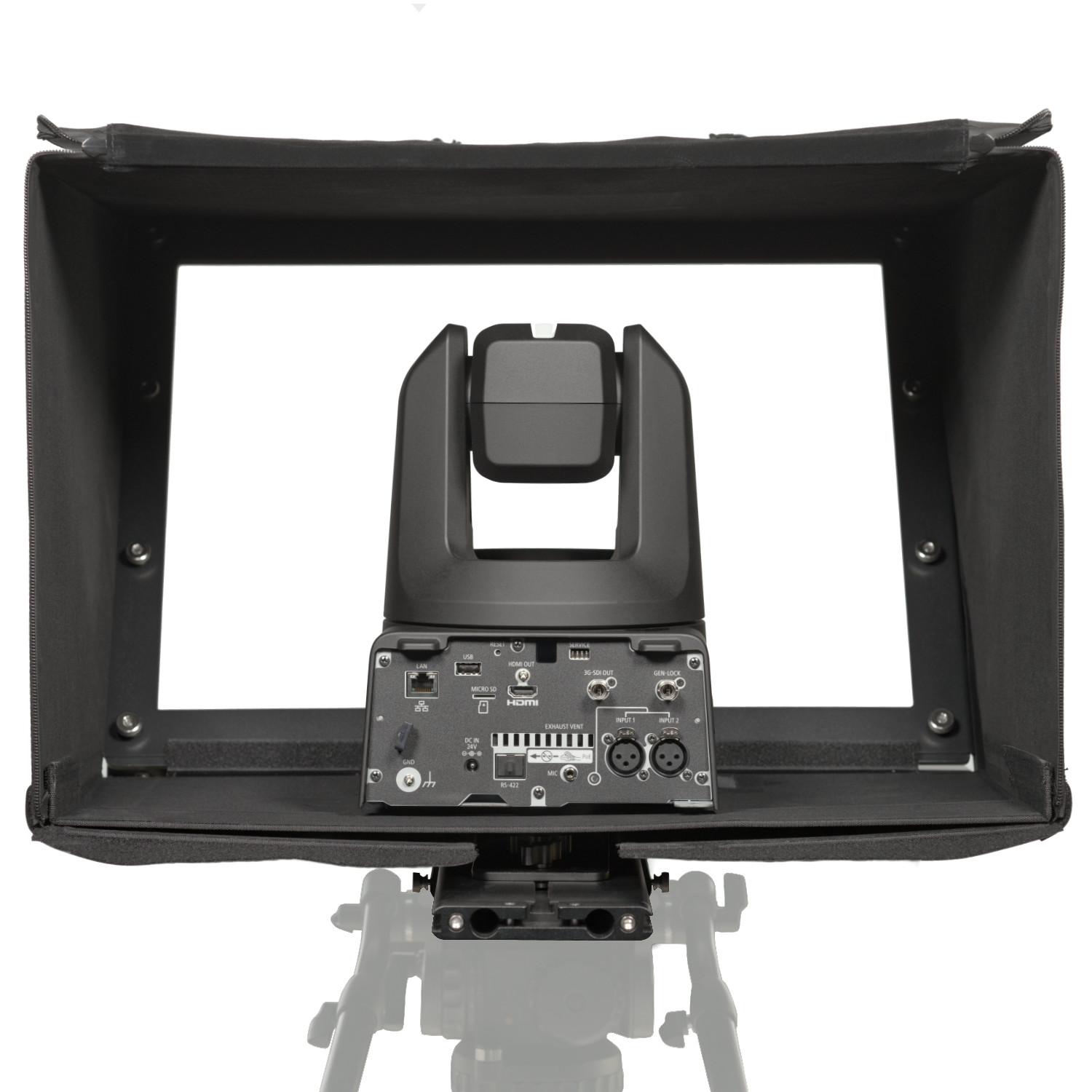 The PTZ teleprompter features a lightweight hood that fully encloses the PTZ camera, which allows it’s movement to remain unconstrained. The hood includes an opening in the back that gives you quick access to the PTZ cameras inputs and outputs. The opening can be closed with a drawstring which removes the possibility of any light leaks.