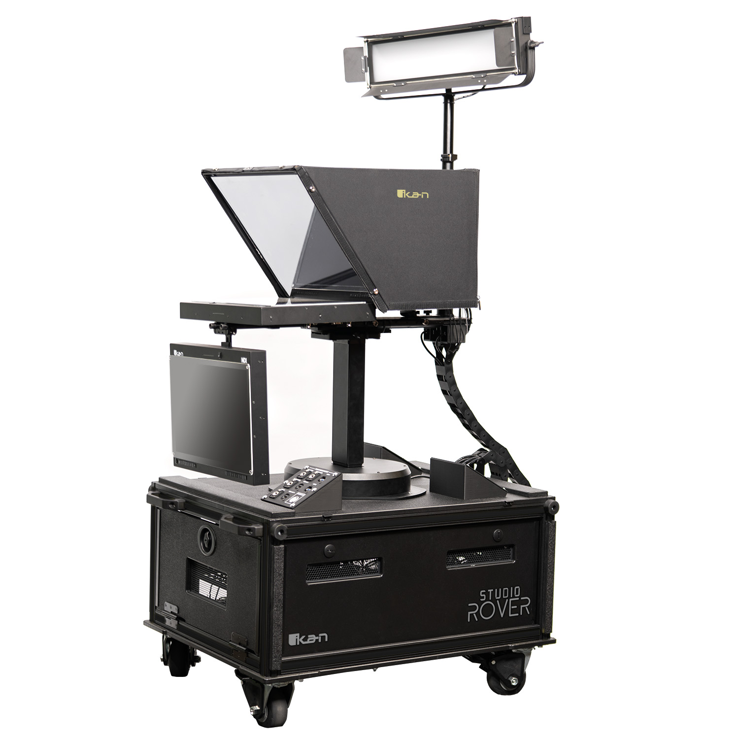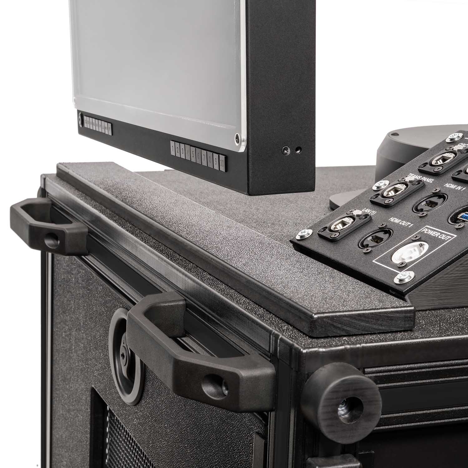 The STUDIO ROVER™ includes a custom-built Big Foot Mobile Systems cart that features a 19-inch rack for centralized equipment management and 4-inch casters for transportation between rooms. Additionally, the teleprompter system can be fully lowered, allowing a lid to be placed on top for long-range transport.