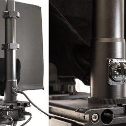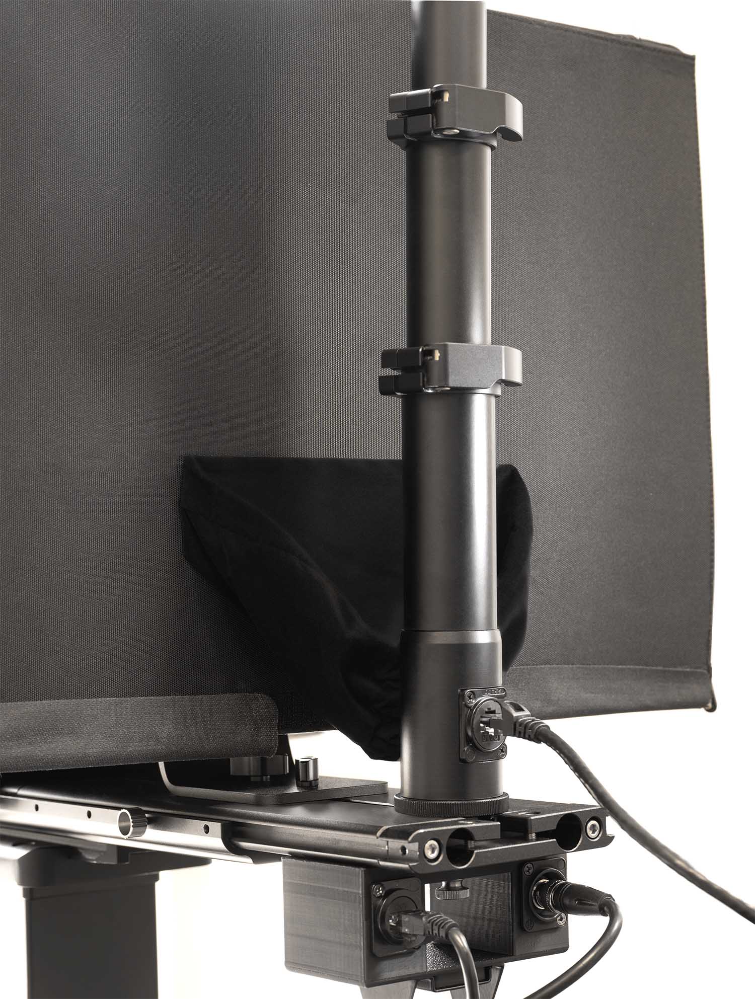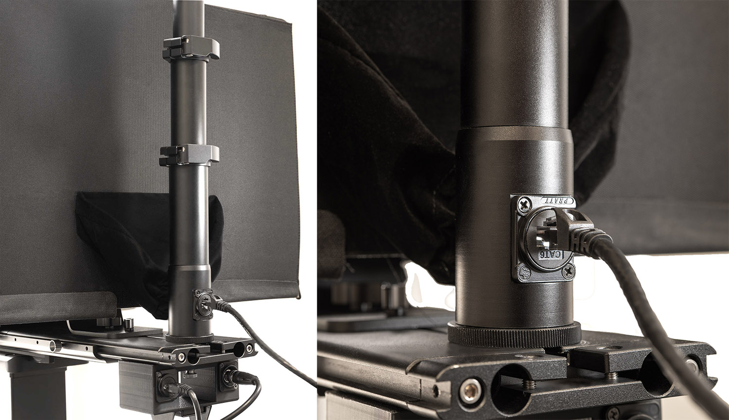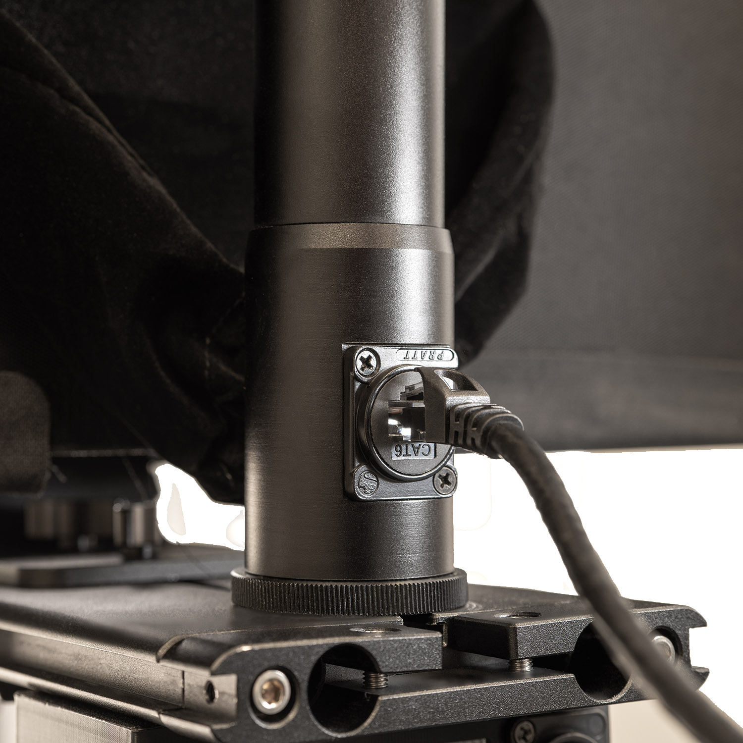 The LSH-POE Light Stand mounts seamlessly to the backside of the teleprompter base, featuring a built-in RJ45 port at the bottom for direct Ethernet connectivity to power and control PoE-enabled lights. A coiled Ethernet cable is routed upward through the stand, where an internal coiled design automatically extends and contracts with the stand’s height adjustments. The cable emerges at the top of the pole, allowing a straightforward plug-in connection to the PoE Light for reliable power delivery and data transmission with a clean setup. This integrated solution enhances setup efficiency and mobility for broadcast and presentation professionals, minimizing cable clutter while supporting seamless PoE functionality.
