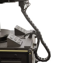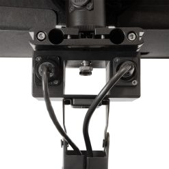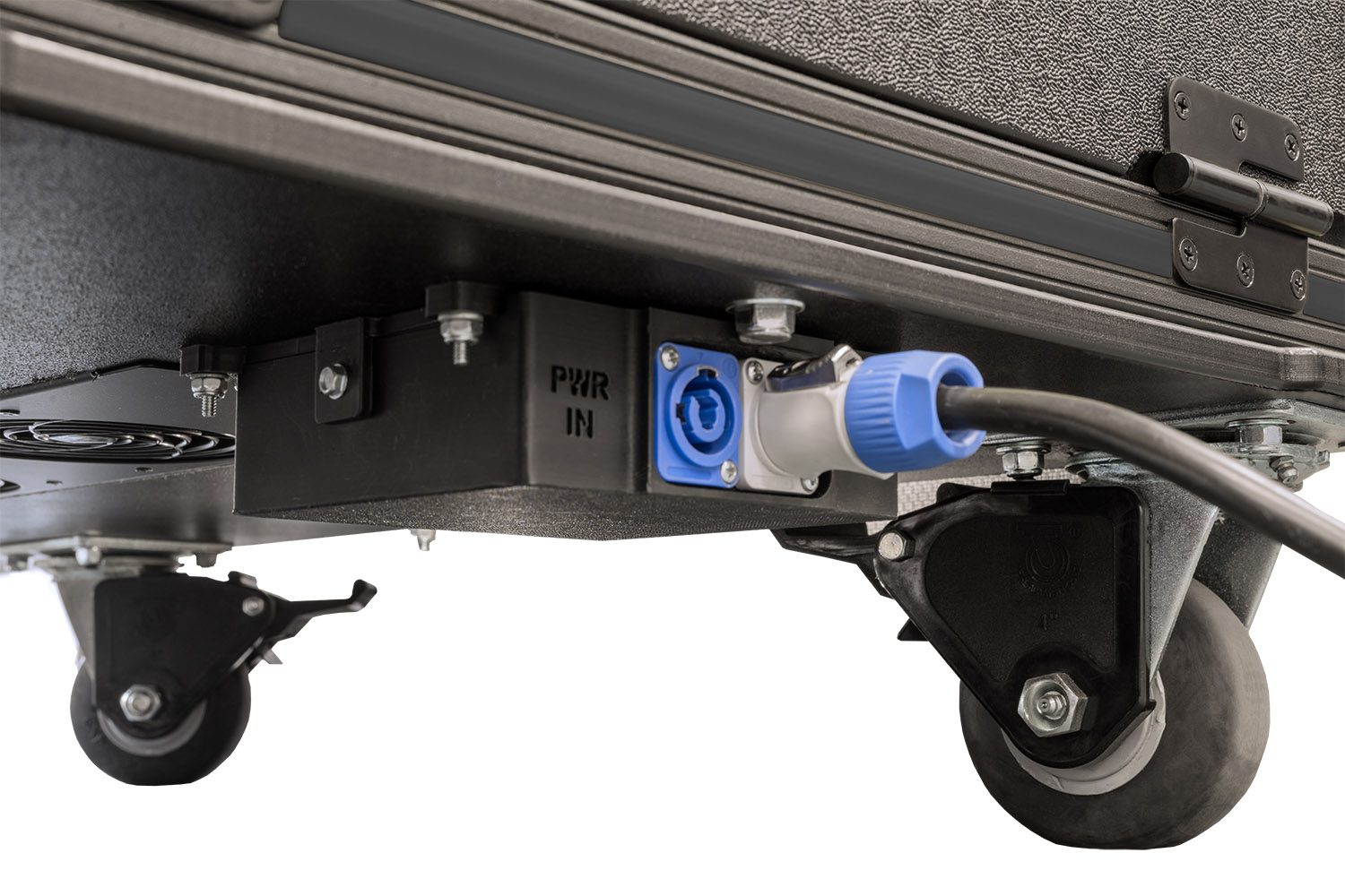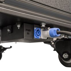 The Neutrik Ethercon Rear Power Pod is a compact, integrated module positioned beneath the cart, delivering reliable power distribution through Neutrik Ethercon connectors with dual 2 Amp outputs protected by built-in breakers for enhanced safety and overload prevention. This design ensures stable, low-noise power supply to rack-mounted equipment, minimizing disruptions in professional AV or broadcast setups. Above the pod, a dedicated cable pass-through rack facilitates organized routing of power and data cables, reducing clutter and simplifying access without compromising the cart’s mobility.