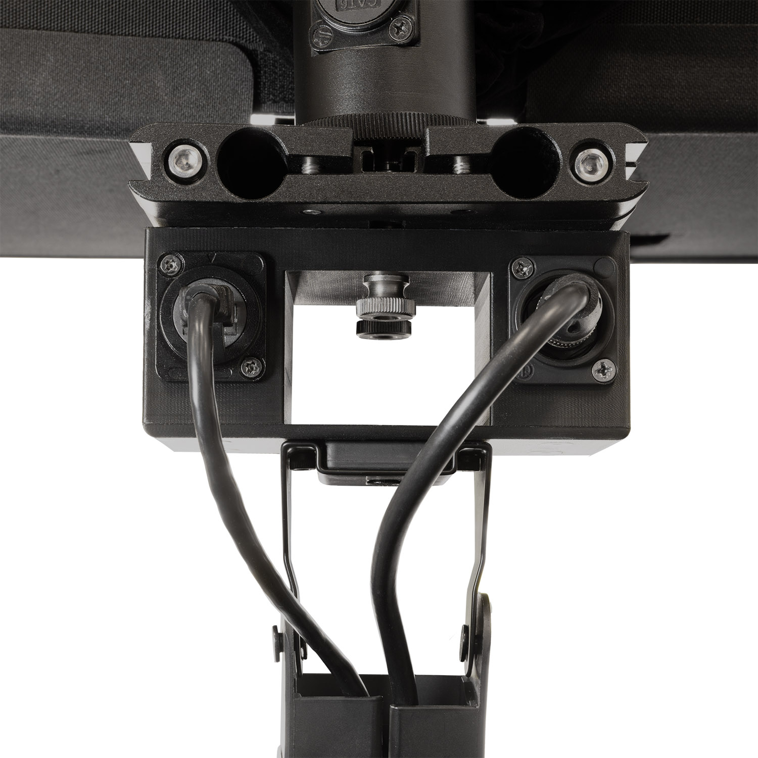 The D-Series Connector Box is a compact, integrated module positioned at the base of the teleprompter, equipped with two versatile D-series patch ports for streamlined cable connectivity. This design allows users to directly plug in cables without routing them through the cable spine or accessing the cart’s interior, saving time and reducing setup complexity in fast-paced environments. Additionally, the box serves as a secure mounting point for the spine, ensuring stable attachment to the teleprompter’s underside for reliable performance during broadcasts or presentations. Ideal for AV professionals, it enhances workflow efficiency while maintaining a clean, organized cable management system.