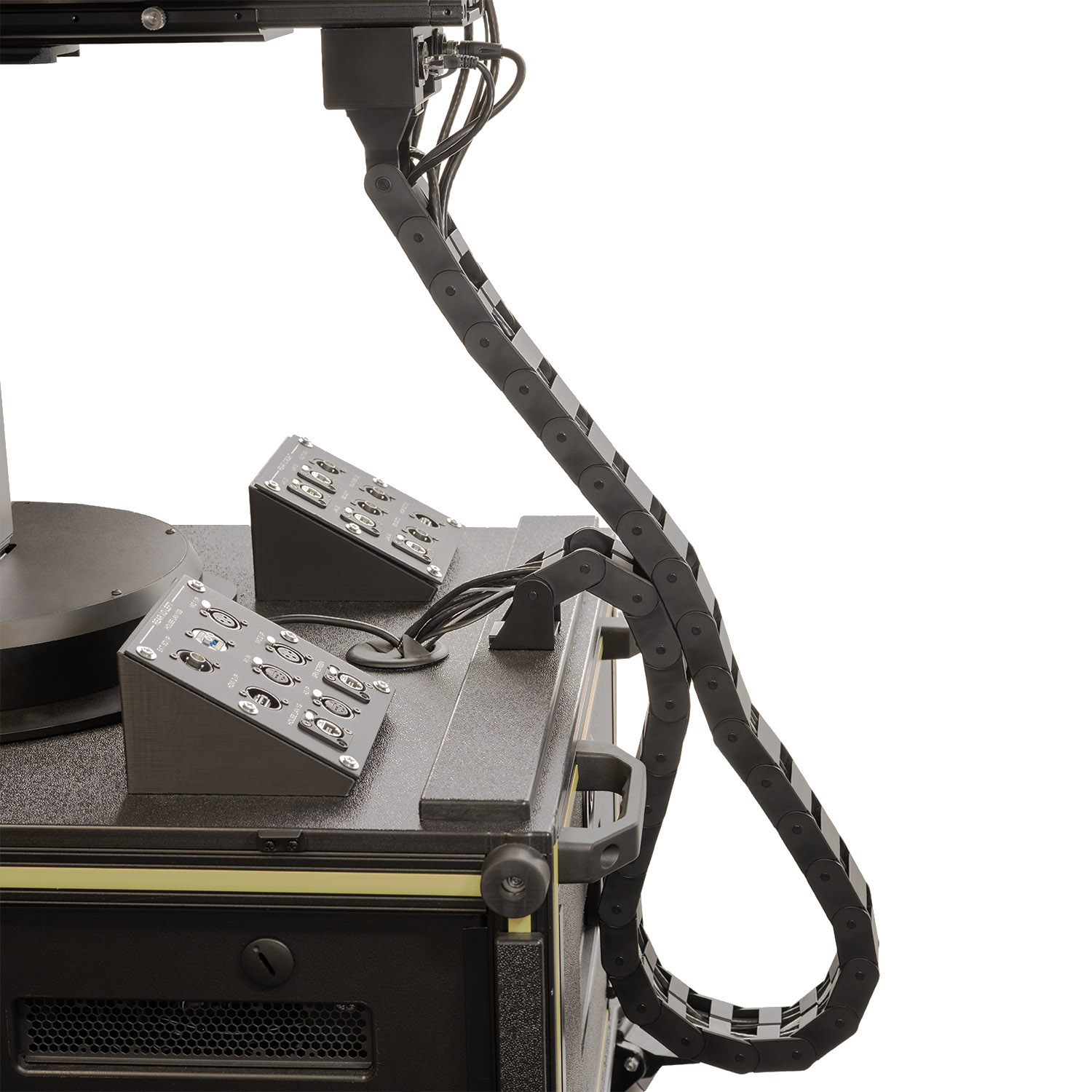 The Cable Management Spine is a flexible, 52-inch long by 2-inch wide organizer designed to conceal and route cables neatly from the teleprompter base to the cart, ensuring a professional, clutter-free appearance in broadcast setups. Cables are easily inserted and secured within its segmented structure, allowing them to flex, fold, and move silently in tandem with equipment adjustments without tangling or exposure. This spine can be shortened or repositioned as needed for custom configurations, enhancing mobility and reducing wear on connections during dynamic operations. Ideal for AV professionals, it promotes efficient workflows and maintains a tidy aesthetic on set or stage.