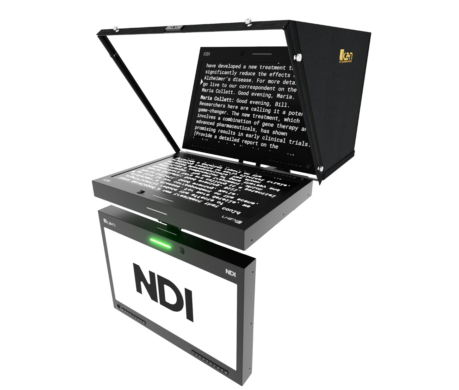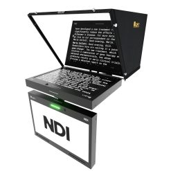 The Aura™ 19-inch POE++ Widescreen Teleprompter with 2x NDI Monitors (PT419W-NDI-TMN) is a lightweight, aluminum teleprompter tailored for networked video production, featuring full NDI encoding/decoding for low-latency video over Ethernet and a 65/35 beam splitter glass that delivers clear script reflection without interfering with camera recording. It includes two 19-inch widescreen monitors with 1920 x 1080 resolution and 1000-nit brightness for vivid text readability up to 25 feet, supporting RJ45 Ethernet, 3G-SDI, HDMI, Composite, and VGA inputs, along with IP tally lights compatible with NDI and vMix switchers, and 10 preset buttons for seamless stream switching. Powered via PoE++ through a single cable for power, video, and tally control, it offers multiple camera mounts, easy balancing, image flip functionality, reusable foam transport, and free PrompterPro4 software for MAC and PC, ensuring efficient, clutter-free professional workflows.