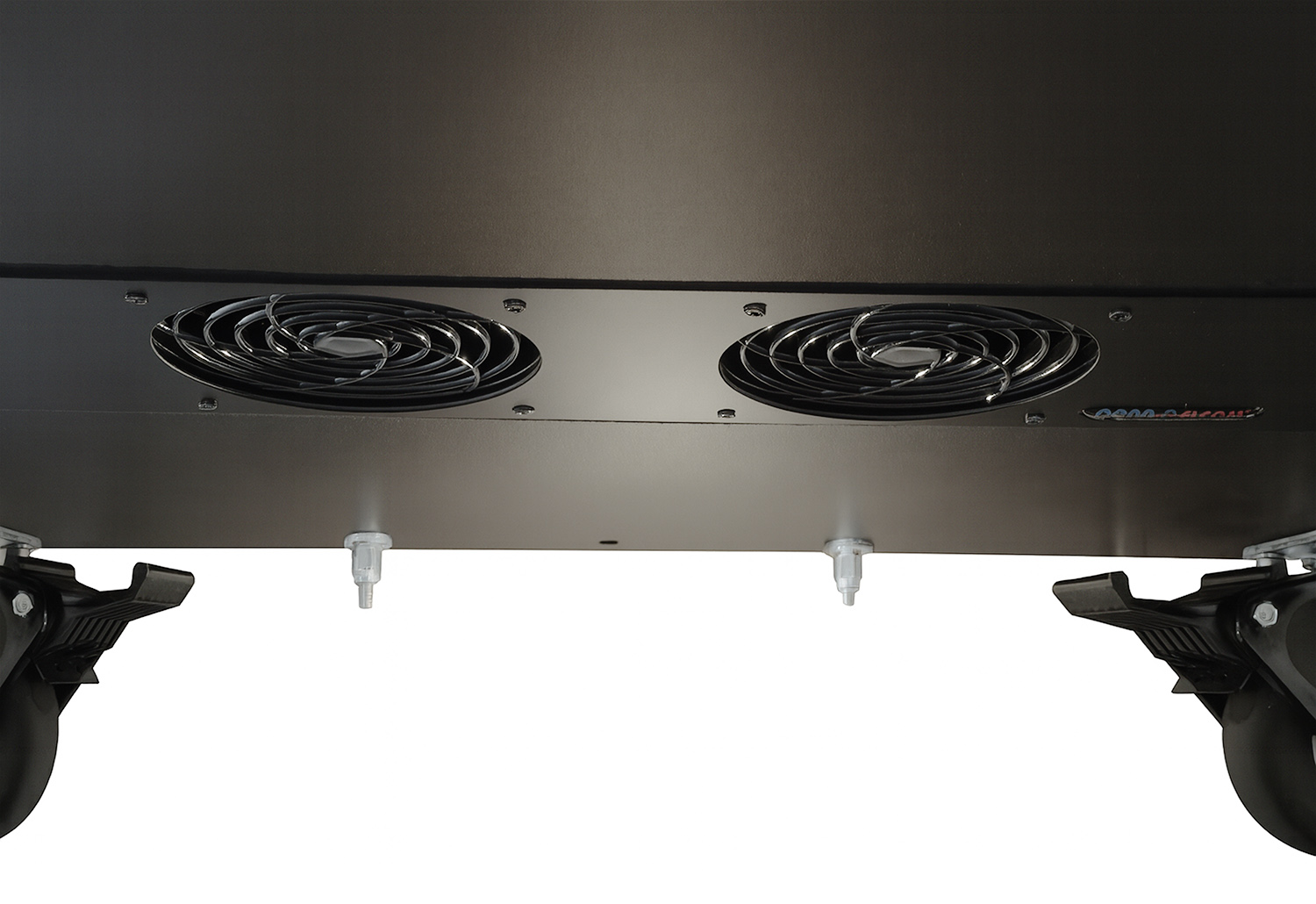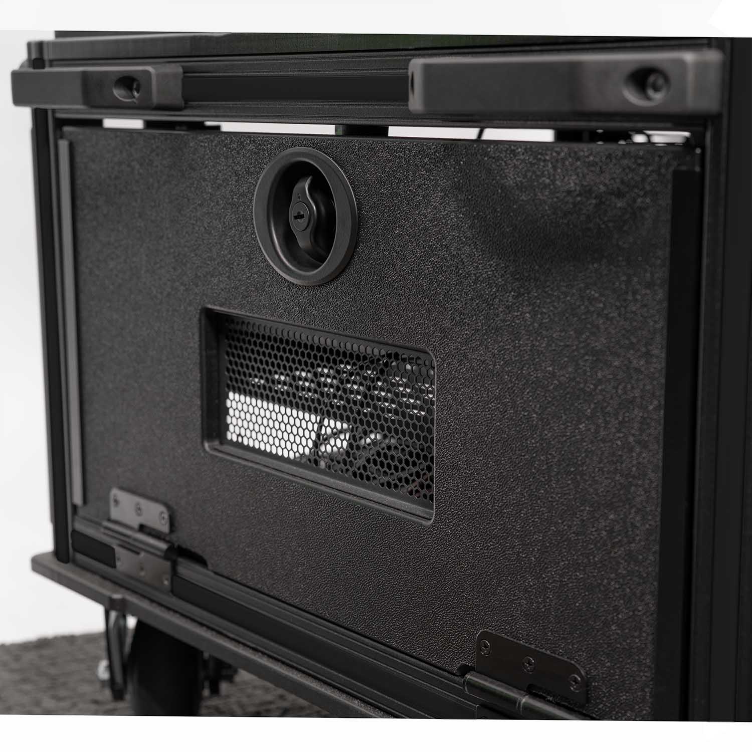 The 19″ 6RU Shock Rack incorporates an efficient active cooling system featuring dual high-performance fans strategically positioned to intake and exhaust air, ensuring optimal circulation throughout the enclosure. This dual-fan configuration effectively dissipates heat generated by internal equipment, maintaining stable operating temperatures even under prolonged use