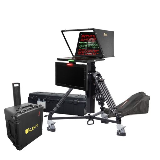 19″ Widescreen PTZ Teleprompter w/ Talent Monitor, Motorized Pedestal & Dolly Turnkey, Travel Kit